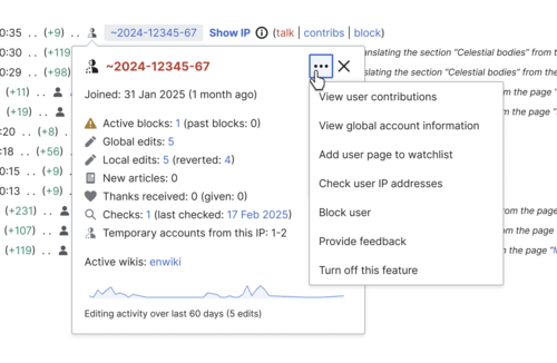 Users meeting the requirements will also have access to useful information about the IP addresses thanks to the IP Info feature. In addition, the User Info card makes it possible for them to see the bucketed count of temporary accounts active on the same IP address range.