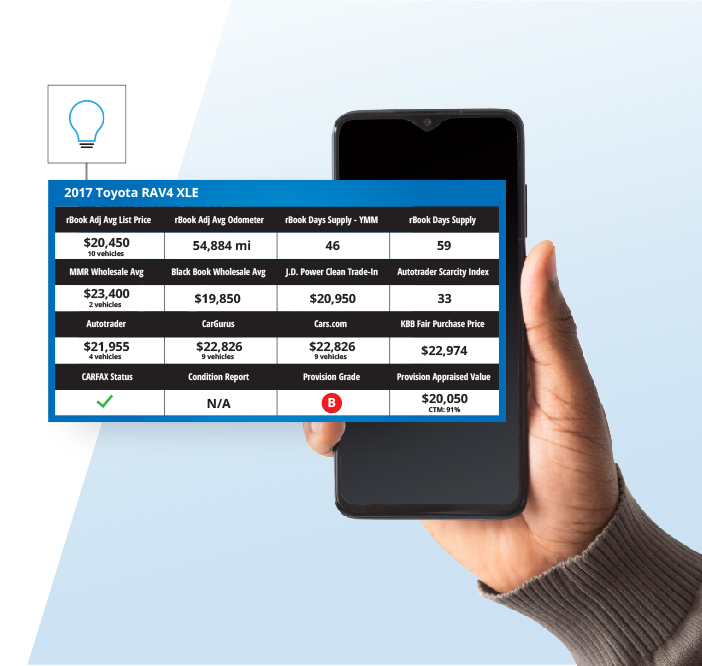 Lightbulbs offer an appraisal-like experience at the click of a button based on vAuto’s live market data.
