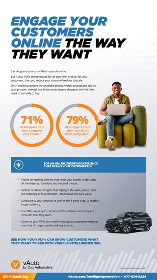 Car shoppers do most of their research online. But if your VDPs are optimized for an algorithm and not for your customers, then you reduce your chance of making the sale. Ditch ancient practices like unedited photos, wordy descriptions and all caps phrases. Instead, use these tactics to give shoppers the info they need to be ready to buy. Discover how you can create an online experience that draws customers in.