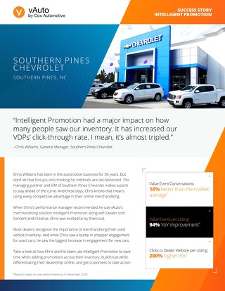 When Chris William’s performance manager recommended he use vAuto’s merchandising solution Intelligent Promotion along with Dealer.com Content and Creative, Chris was excited to try them out. Take a look at how Southern Pines Chevrolet uses Intelligent Promotion to save time when adding promotions across their inventory, build trust while differentiating their dealership online, and get customers to take action.
