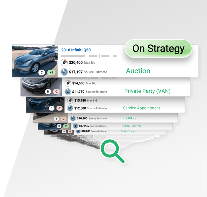 Apply your strategy to every appraisal and retail pricing. See a recommended price to pay for a vehicle according to the strategy you set for your dealership and know how to price a vehicle if you acquire it.